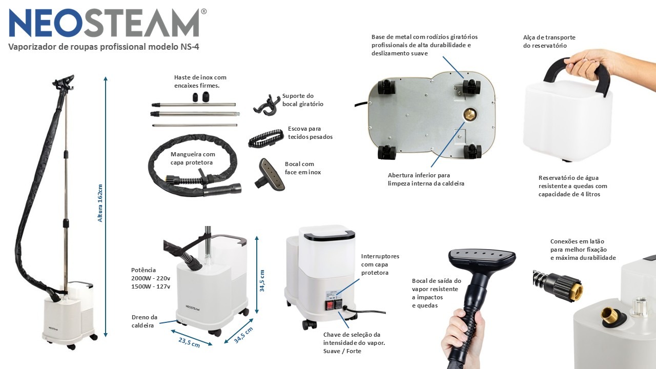 - O vaporizador profissional NeoSteam NS-4 tem a maior potência do mercado, 2000W na versão 220V e 1500W na versão 127V.
